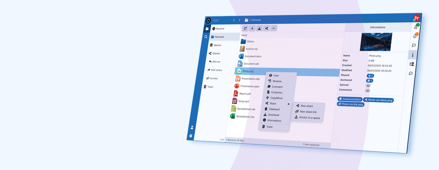 Sync-in 2.1 aggiorna l'interfaccia web con una nuova barra laterale, migliora la leggibilità su tutti i dispositivi e aggiunge il nederlandese tra le lingue supportate. Compatibilità estesa con OnlyOffice 9.3.