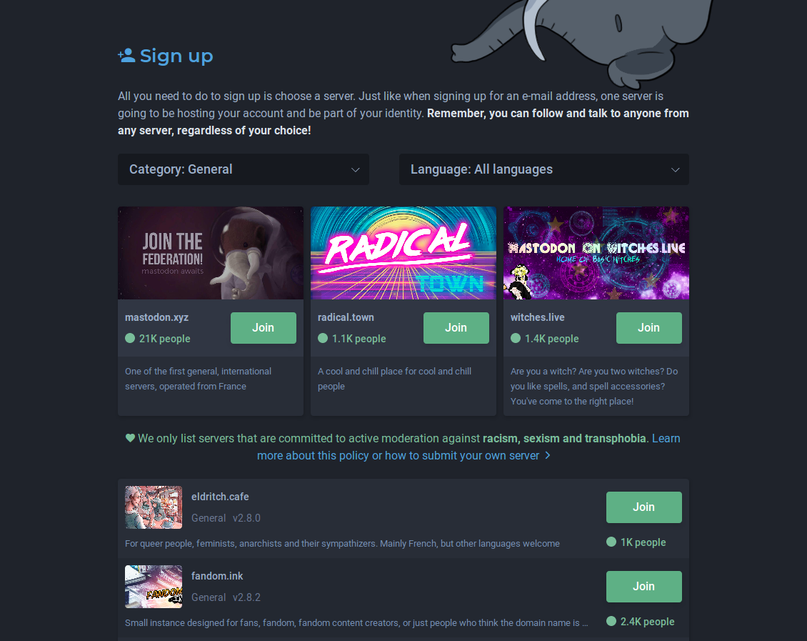 One of the challenges of Mastodon adoption is the onboarding process, because itâs not enough to capture a personâs desired username and e-mail and let them create an account, which is what people are used to from major websites; instead, you need to first choose a Mastodon server where you will make the account (comparable to e.g. choosing an e-mail provider). The implications of choosing the server are primarily in who is the entity responsible for the server, what moderation policies they enforce, what language and jurisdiction they operate in, and which domain name will be part of your username.