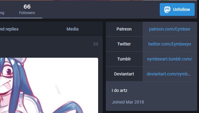 The public areas of the web interface have been redesigned. The color scheme and design is now more consistent with the logged-in interface. The new profile layout makes better use of space for bio text and increases the value of header images. Prominent follow buttons ensure that even people new to Mastodon understand quickly what they can do on it.
