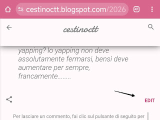 Per facilitare l'editing rapido dei post su questo mio sito Blogger, ho creato un piccolo snippet di codice JavaScript che aggiunge in automatico un tasto "Edit" in fondo alle pagine di tutti gli articoli che, cliccato, riporta direttamente alla pagina di modifica di ogni articolo nell'interfaccia di amministrazione di Blogger: [PageCode EditButtonScript] Detto che lo script è progettato specificamente per quello che è il tema attuale del sito al momento in cui scrivo, Contempo, mentre con altri probabilmente non funzionerà proprio, questo in foto è il risultato finale: semplice e molto comodo. Può essere tranquillamente copiato su altri blog per potenziare l'esperienza, tramite un gadget HTML/JavaScript. ❤️‍🔥 Purtroppo, non ho trovato un modo per mostrare dinamicamente il tasto solo a me, cioè solo quando il browser ha una sessione attiva con il mio account Google proprietario di questo blog, per cui è visibile a tutti... ma, essendo molto discreto, non penso sia un problema estetico. (E, a livello pratico non c'è ovviamente alcun problema, perché il link non fa nulla di magico, bensì riporta semplicemente al pannello admin di Blogger; serve comunque il login del proprietario del sito per modificare.)