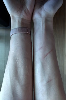 Essendo state per la fine di questo mese di febbraio in programma delle nuove analisi del sangue per me, come previsto per via della mia terapia ormonale, per qualche settimana ho di nuovo dovuto evitare di tagliarmi sul braccio sinistro... Questo perché non sarebbe proprio il massimo farmi prelevare il sangue da un braccio pieno di segni sospetti, quando voglio evitare di farmi sgamare dai miei genitori ad aver ripreso il vizio, ma sorvoliamo su ciò. Beh, per fortuna non sono ancora al punto delle cose per cui le mie mani si muovono da sole, quindi per queste settimane mi sono semplicemente tagliata altrove, e non ci sono stati problemi... o, almeno, non mi sono fatta problemi... fino a quando, proprio pochi giorni fa, avevo notato che alcune linee sulla parte bassa del mio avambraccio sinistro — relativamente vicino a dove si infila l'ago, maledettamente — erano vagamente troppo visibili per i miei gusti in questo caso... Tralasciando come non mi capacito che non siano completamente sbiadite nel giro di ormai 3 settimane da quando le ho fatte, visto che erano assolutamente superficiali, fatto sta che, a causa di questa mia terribile scoperta sono andata... non direi in paranoia, perché sarebbe un'esagerazione, ma certamente ci ho pensato una ventina di minuti più del dovuto (il quale avrebbe dovuto essere 0) nel corso di un paio di giorni. Almeno per me, che so che ci sono, e quindi me ne preoccupo per l'ovvio terribile motivo, sembravano fin troppo visibili, sia controllando di persona che guardando in questa foto (scattata oggi, quindi è da tenere in conto che forse qui appaiono lievissimamente più invisibili rispetto a quando ho iniziato a preoccuparmi)... non tanto per il colore in sé, che in effetti è comparabile al resto della pelle e, per esempio, è molto meno apparente del bianco delle mie cicatrici permanenti; ma, più che altro, proprio per la disposizione a linee circa parallele molto ravvicinate, che nella mia testa è per l'appunto sospetta. Alla fine, però, tutte le mie paturnie si sono rivelate fortunatamente inutili: il prelievo di sangue l'ho fatto stamattina, venerdì 20, e... non è successo assolutamente niente, menomale!!! E, probabilmente, anche se lo avessi fatto ieri, giovedì 19, il risultato sarebbe stato lo stesso. Nessuno ha (ri)scoperto cose che non gli spettano, e io non ho avuto ancora un altro nuovo motivo per disperarmi dalla vergogna oggi... Morale della favola: penso sempre troppo più del dovuto, io, facendomi problemi che in fondo non esistono... ma questo già si sapeva.