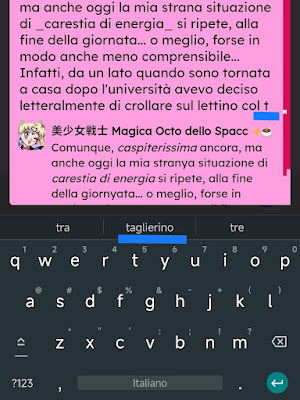 A volte, nei momenti più inaspettati, mi trovo che sto semplicemente cercando di scrivere qualcosa di assolutamente normale sul telefono... e il correttore della tastiera se ne esce con suggerimenti per completare le frasi che sono come minimo particolari, o forse a volte inquietanti, boh. Per non tenermeli solo per me a questo punto, li collezionerò in questa pagina, in sezioni tematiche... Quando il correttore mi rinfaccia i miei vizi Qui volevo scrivere che, per provare a rilassarmi in uno strano momento, mi ero messa sul lettino col tablet... ma al correttore è bastato leggere "sul lettino col t" per assumere che io avessi scelto un altro per me non insolito modo per rilassarmi, e quindi della parola "tablet" neanche l'ombra, ma immediatamente mi è stato suggerito "taglierino"... e a questo punto non posso fargliene una colpa, dopo tutte le cose che avrò scritto nel tempo, però porca miseria che presa in giro!!! --- _Fine... per ora._