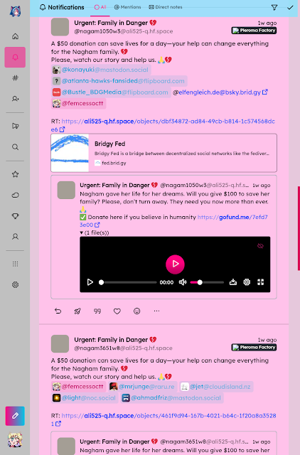 Sul Fediverso, più che su altri social a quanto pare (anche se io altri a parte Telegram non ne uso, ma comunque su quelli commerciali guidati da algoritmo girano cose diverse secondo meccanismi diversi), girano spesso richieste di donazioni da gente a caso che ha qualche bisogno, spesso ricondivise da altra gente a cui o fa pena, o pensa di poter aiutare concretamente rigirando i vari messaggi al proprio pubblico. Al di là di se il tutto funzioni o no, e al di là di come certe persone in genere con questo modus operandi (sia chi fa queste richieste, sia chi ricondivide i messaggi) finiscano per riempire malamente le timeline dando all'effettivo solo fastidio (almeno, a me certamente, non avendo io soldi da donare a chiunque, a maggior ragione se i metodi possibili non sono né contanti, né gift card, né criptovalute, ma altri pagamenti digitali che io sostanzialmente neanche ho)... alla fine, ci sta tranquillamente che chi ha bisogno chieda aiuto, e tutte le cose affini... Ciò che però non va bene è fare invece del vero e proprio spam, taggando gente a caso, con cui mai si è interagito, in messaggi non richiesti, per l'appunto solo per chiedere queste fottute donazioni, senza neanche sapere a chi lo si sta chiedendo, e nemmeno facendo finta di farlo. Per fortuna, non è un fenomeno diffuso, perché la maggior parte della gente che chiede donazioni non è fottutamente fumata... ma è bensì un fenomeno che pare alquanto nuovo, qui sul Fediverso; e questo tuttavia secondo me non è un motivo di conforto, bensì uno per preoccuparsi e bestemmiare. Ne ho sentito parlare da almeno un paio di mesi, praticamente con l'inizio di questo 2026, senza inizialmente avere bene idea del fenomeno... e, giusto di recente, ho ricevuto anche io qualche messaggio del genere, sul mio profilo Misskey selfhostato (precisamente, quello in italiano che uso attivamente, ma dove nemmeno scrivo mai in inglese, eppure questi hanno mi scritto in inglese, vabbè)... ben 4 tutti uguali, se non per il fatto che in qualcuno gli altri malcapitati taggati sono diversi, tutti in una sola notte. (Precisamente, il 5 marzo alle 0:56, 3:50, 3:51 e 3:57; e poi per fortuna nient'altro, per ora.) Al di là dei miei possibili pensieri personali su questa specifica richiesta e chi l'ha inviata (non si sa perché taggandomi 4 diverse volte, ma a questo punto chissà quante volte sarà stata disturbata altra gente ancora), comunque, questi messaggi sono lievemente interessanti... a livello tecnico proprio, e anche al di là dei tag duplicati sensa motivo. Infatti, almeno questi messaggi arrivati a me, sono da un'istanza chiamata "Pleroma Factory"... nome che di per sé, anche cercando sul web, non suggerisce nulla di utile, se non il fatto che è stato evidentemente messo su un server con software Pleroma per fare questa magagna, come si evince anche dal formato degli URL dei post... da un dominio altrettanto senza senso in questo caso, cioè `ali525-q.hf.space`, da account tutti diversi ma con un determinato formato per gli username: `@nagamXXXXwX` (dove X è un numero). <iframe src="https://brutkey.octt.eu.org/embed/notes/ajgi9342amuh0c4m?colorMode=light&instance=shark.octt.eu.org" data-misskey-embed-id="v1_181878a8-7e6f-4778-8dd0-ca5e93832cba" loading="lazy" referrerpolicy="strict-origin-when-cross-origin" style="border: none; width: 100%; max-width: 500px; height: 300px; color-scheme: light dark;"></iframe> Qualcuno che ho beccato per caso suggerisce di aggiungere il dominio marcio alle proprie liste di blocco della federazione, ma forse non è nemmeno necessario... perché questo qui nello specifico sembra morto — oltre che strano, perché è un sottodominio di `hf.space`, che sarebbe una specie di hosting offerto da Hugging Face, ma non credevo fosse buono per eseguire Pleroma... ma beh, per l'appunto non carica il sito, a dire il vero — e poi, se il problema è generalizzato come sembra, ne spunteranno fuori inevitabilmente altri. Insomma: la situazione è schifosa e, se il problema diventa effettivamente grosso, e non rimane perlopiù aneddotico come per ora sembra ancora essere, serviranno purtroppo soluzioni più nucleari... del tipo che, come avviene da decenni per le email, i software del Fediverso dovranno integrare tecniche avanzate di filtraggio dello spam per i messaggi in ingresso, con machine learning ed altra roba complicata... evviva... (O, altrimenti, su alcuni è già possibile impostare il proprio profilo per rifiutare i tag da utenti con cui non si è mai interagito, credo, ma questa è un po' brutta come soluzione su un social.)