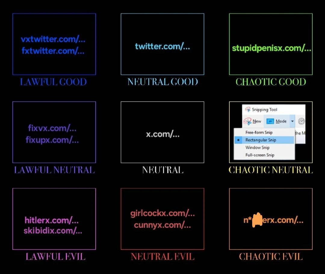 @femcessoctt, 2026-02-04 15:42 RE: https://t.me/eternalclassic/81925 Ho trovato anche questo altro memino strano oggi, che... non riesco a comprendere esattamente. 😐 Cioè, è il classico grafico di allineamento dei valori, in cui in questo caso sono piazzati i metodi attraverso cui si condividono i post di Twitter/X da altre parti... e però non ho ben capito…