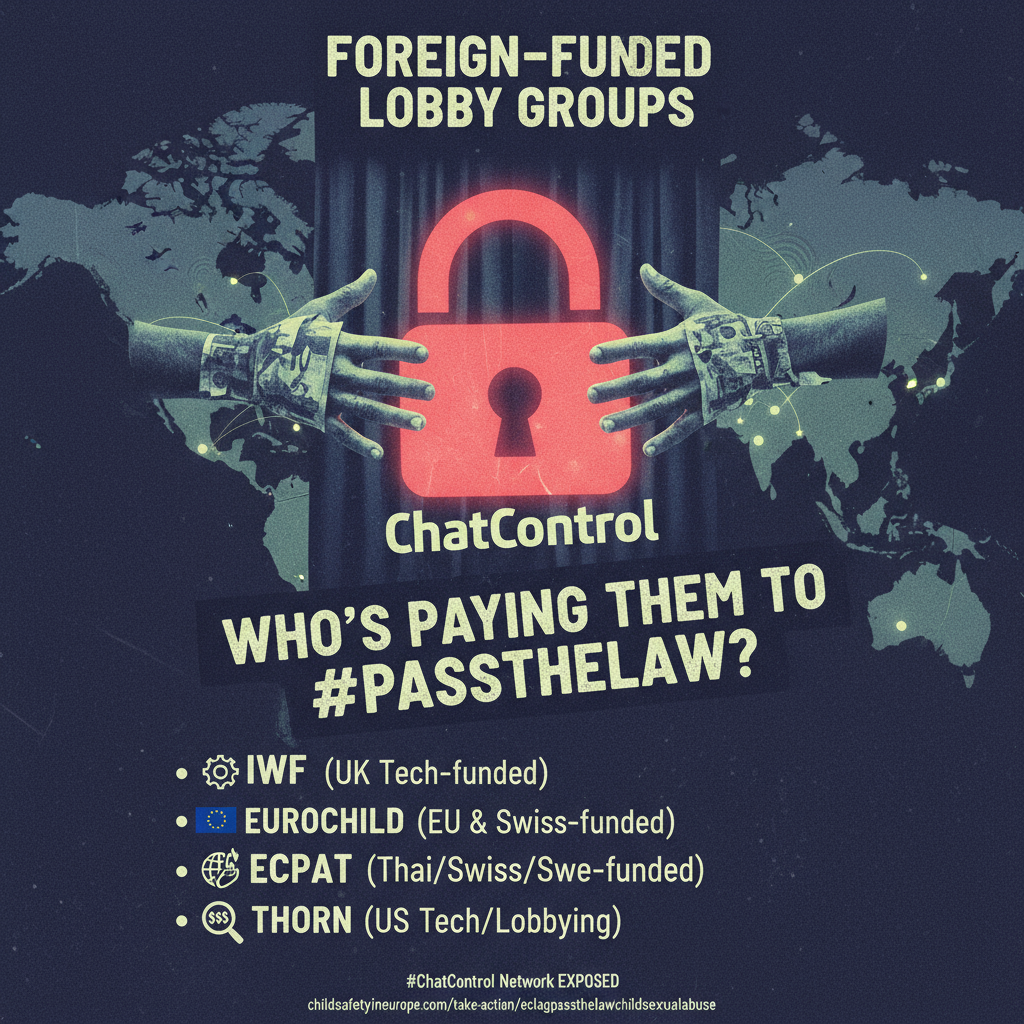 Alcune lobby finanziate dall'estero, provenienti da paesi extra-UE, stanno promuovendo #ChatControl con propaganda fuorviante. Vogliono #PassTheLaw per scansionare le tue chat, ma chi sono e chi li paga? Smascheriamo la rete dei promotori della sorveglianza!